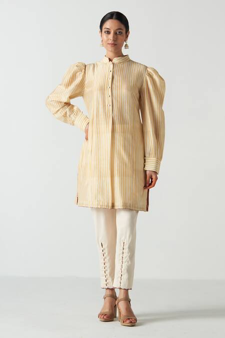 Yellow Chanderi Mandarin Collar Striped Kurta Set