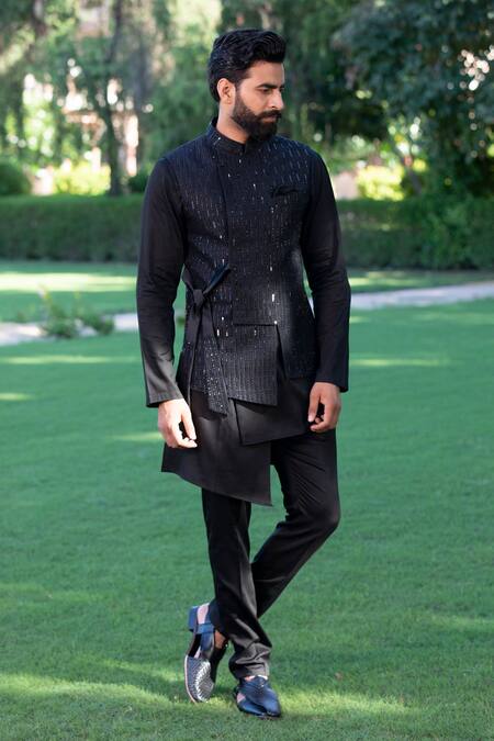 Black embroidered Nehru jacket featuring sequins and cutdana work with an overlap front. Paired with a full-sleeve kurta and pyjama, both in handloom silk and Russian silk.