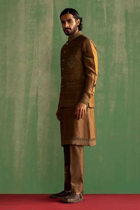 Brown bundi featuring dori and bead placement embroidery in floral design. Paired with a border embroidered pintuck kurta and pant.