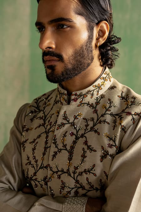 Light grey bundi featuring dori and sequin embroidery in floral vine pattern. Paired with a border embroidered pintuck kurta and ivory pant.