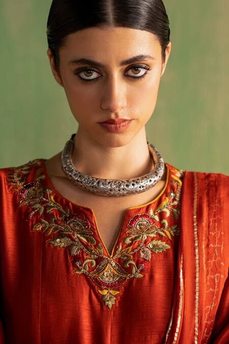 Rust Anarkali featuring sequin, beads, and thread embroidered neck & sleeves in floral pattern. Paired with an embroidered hem pant and dupatta.