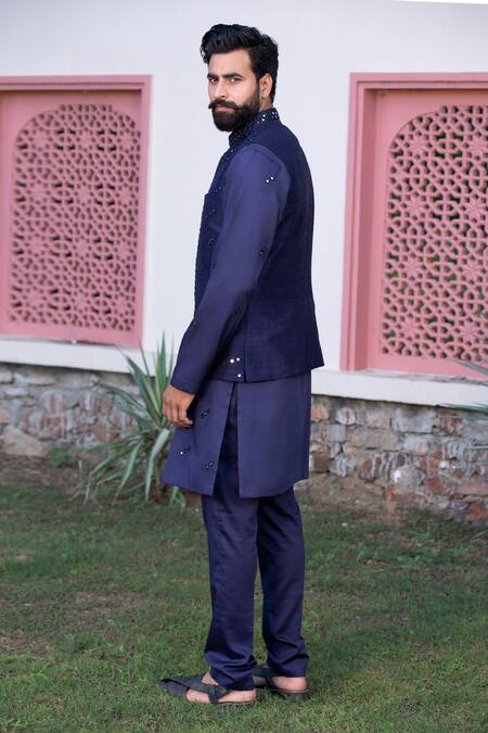 Blue Nehru jacket featuring mirror and resham embroidery with a concealed placket. Paired with a full-sleeve kurta and pyjama, both in matching blue.