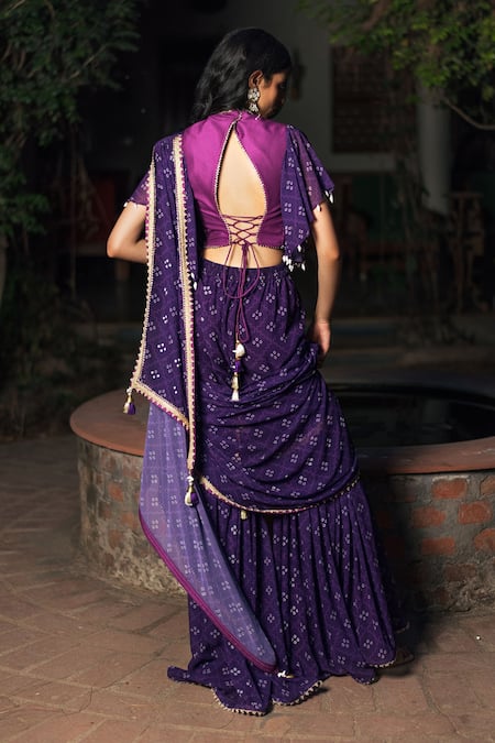Purple Georgette Story Pre-draped Bandhej Print Sharara Saree With Blouse
