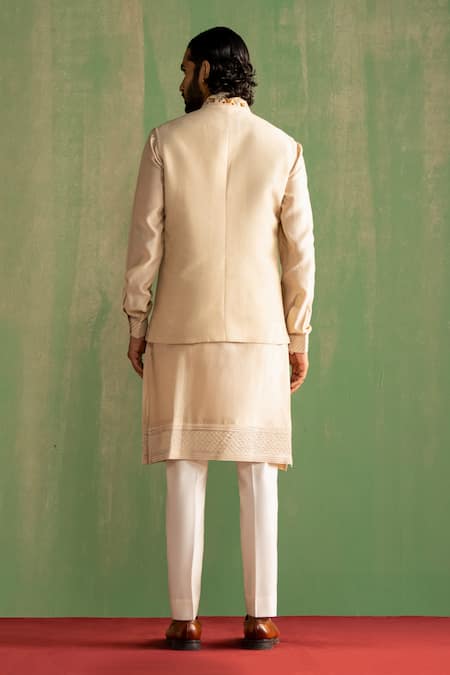 Ivory bundi featuring floral embroidery with dori, aari, cutdana, bead, and sequin work. Paired with a pintuck embroidered kurta and pant.