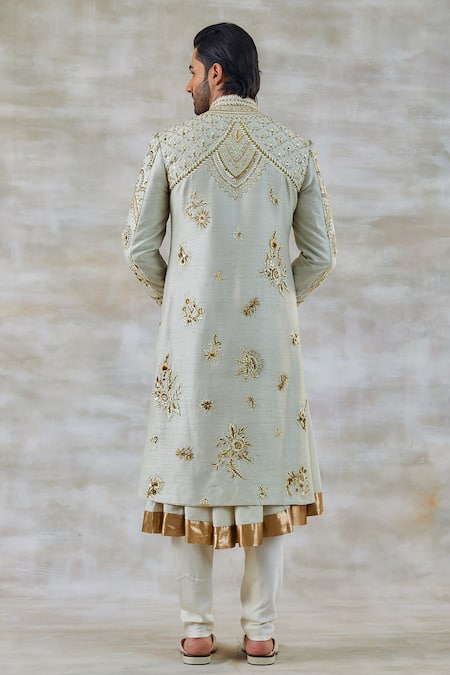 Ivory raw silk sherwani featuring intricate floral embroidery with zari, resham, cutdana, and sequins. Paired with a plain kurta, pants, and embroidered juttis.