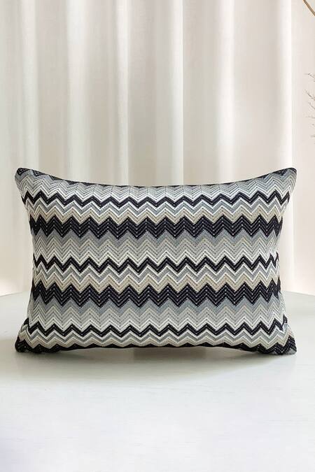 White, black, grey rectangle shaped cushion cover with thread embroidery in geometric chevron pattern.