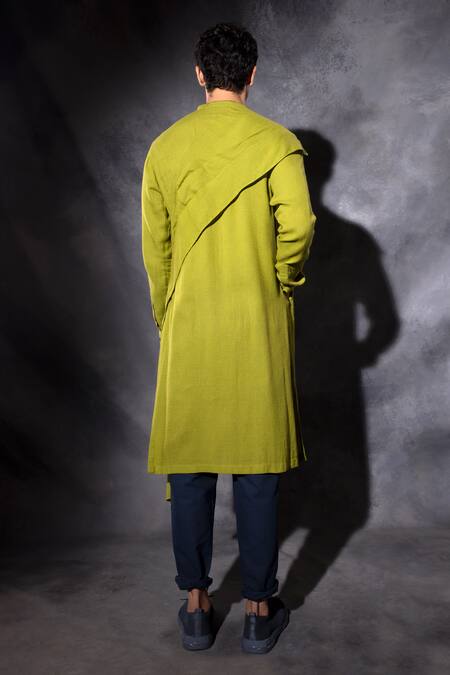Yellow kurta featuring hand embroidered contrasting threadwork and an asymmetric draped design