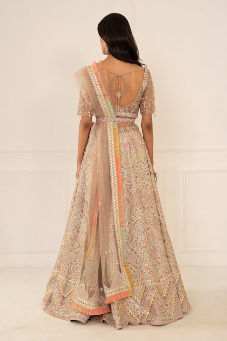 Multicolored lehenga highlighted with gota-mirror, pearl embellishments & lace trim hem. Comes with V-neckline blouse & dupatta.