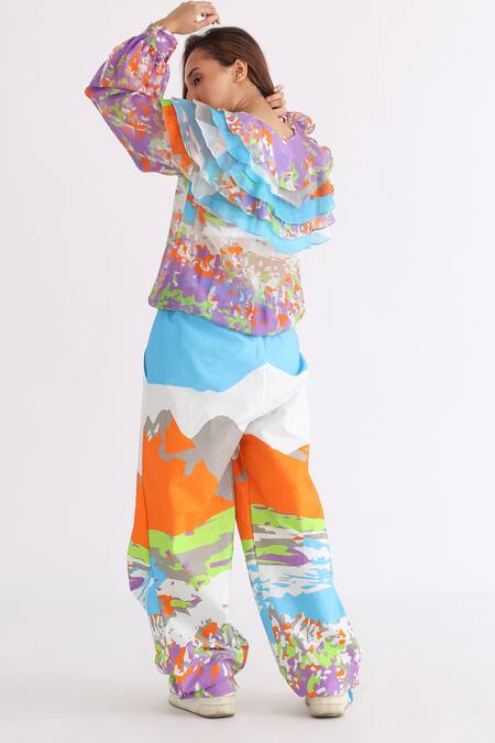 Multi color dhoti style pant crafted from 100% cotton featuring an all-over abstract camo print