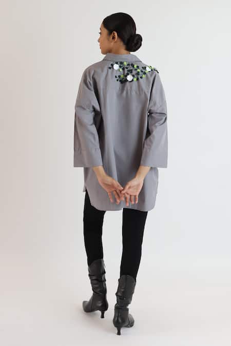 Buy_Studio Moda India_Gray Cotton Applique Collared Boxy Embroidered Shirt _Online_at_Aza_Fashions