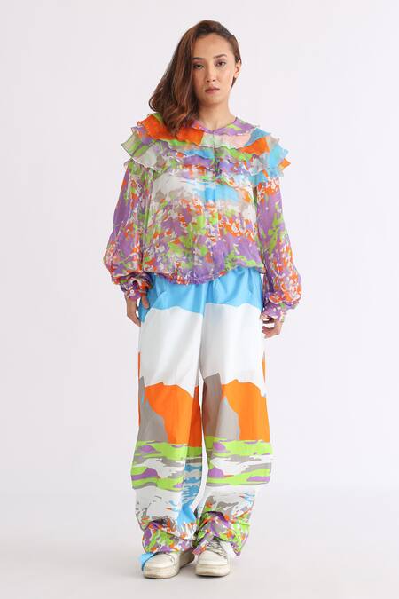 Multi Color Organza Ruffles Round Neck Bellatrix Abstract Pattern Shirt