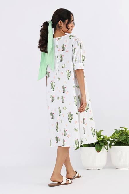 White Linen Round Neck Cactus Print Dress