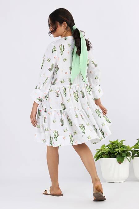 Cactus print design across the fabric, Balloon sleeve detail, Tiered skirt design