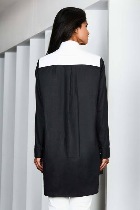 White & black colorblock shirt with chest flap pockets, panel detail & high low hem.
