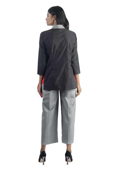 Black, grey & red colorblock handkerchief shirt with front-button closure, panel detail & side drapes.