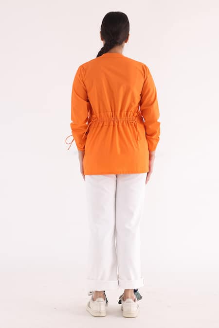 Orange Cotton Chains Mandarin Collar Drawstring Detailed Shirt