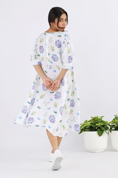 White Linen Round Neck Floral Print Midi Dress