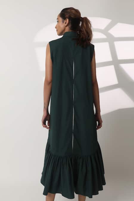 Bottle green woven cotton shirt dress featuring an asymmetric tiered hem and shirt collar