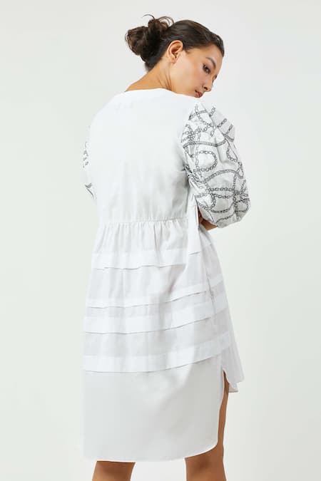 White flared short dress with pleated detail, placement chain motif work, overlap-style yoke & balloon cuff sleeves.