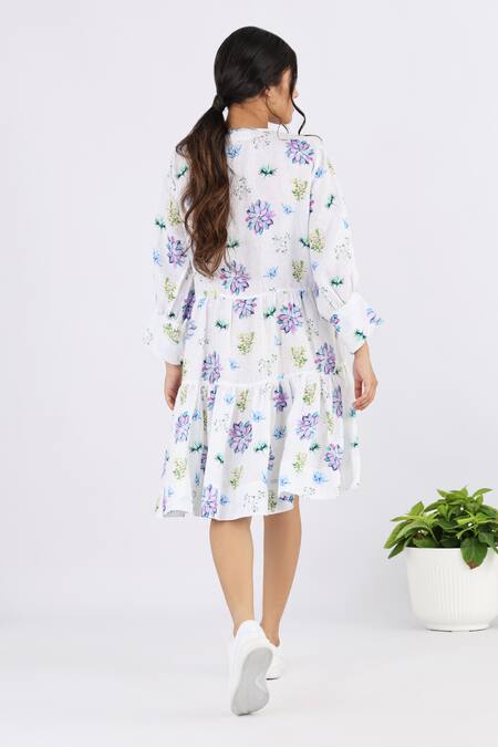 Balloon sleeves add a trendy touch., Tiered design enhances the dress's flow., Floral print adds a vibrant look.