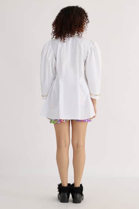 White Cotton Embroidery Collared Pucker Exaggerated Sleeve Plain Shirt