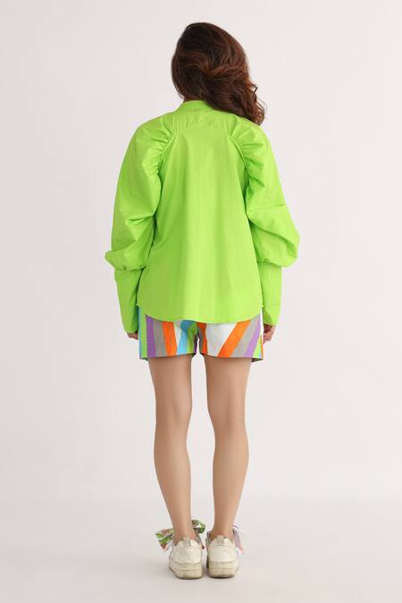 Green cotton shirt featuring raglan puff sleeves and a collared neck
