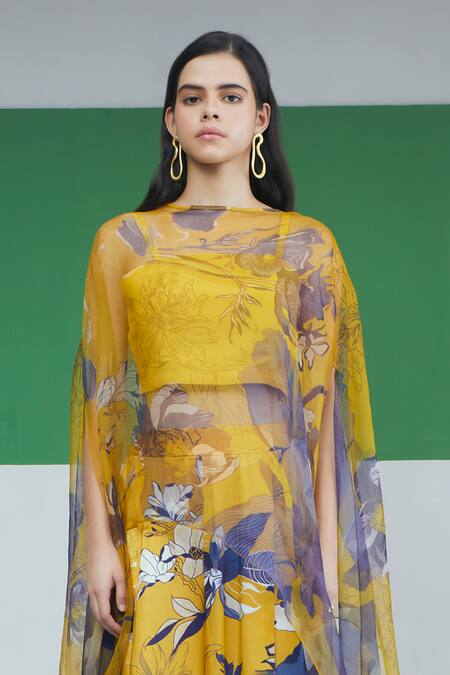 Yellow Crepe, Organza, Silk Satin Boat Bloom Garden Print Cape Flared Pant Set