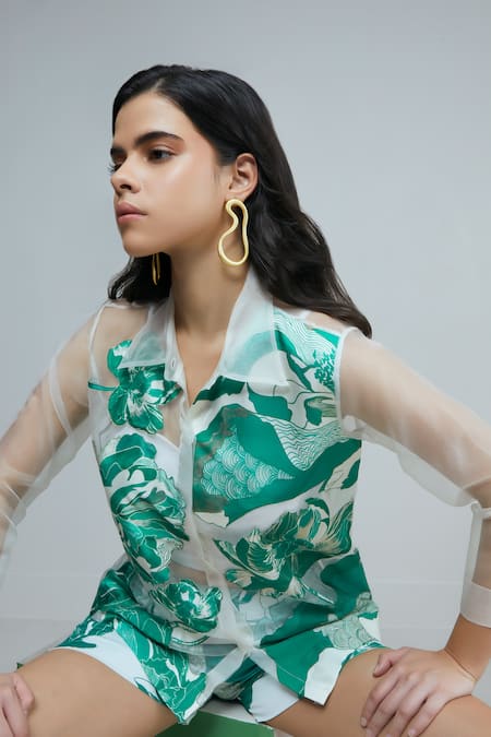 White Organza, Cotton Applique Collared Blossom Shirt Shorts Set