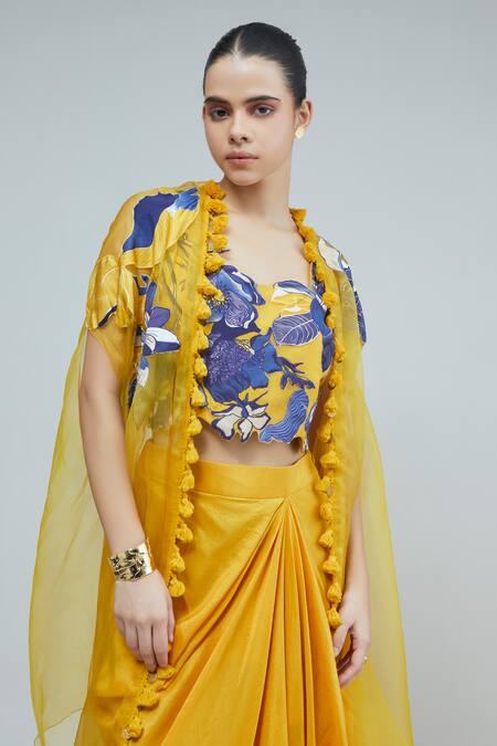 Yellow organza cape featuring winged sleeves and bluebell applique detailing. Paired with a matching crop top and solid draped skirt.