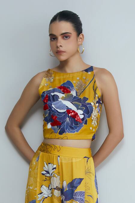 White organza cape featuring bloom applique detailing. Paired with a sleeveless halter neck crop top and matching printed flared pant in vibrant yellow with botanic bloom print and sequin embellishments.