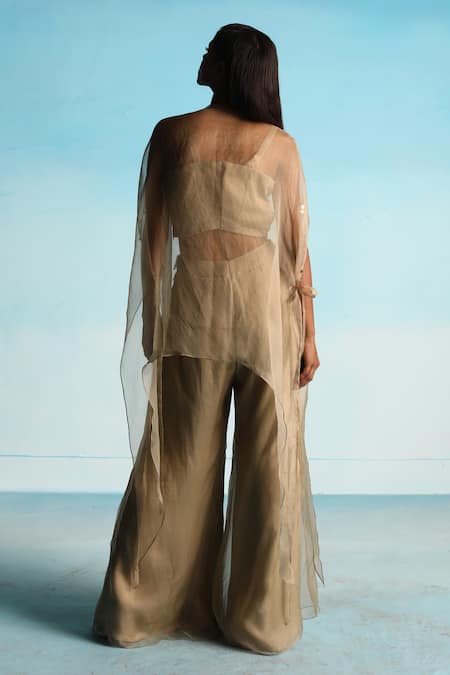 Beige organza cape featuring applique hand embroidery and flared sleeves. Paired with a sleeveless pure crepe crop top and matching pant.