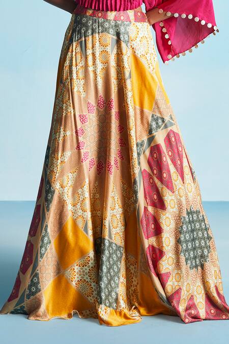 Hot pink lehenga featuring a bold Marrakech print and a length of 42 inches. Paired with a pure silk top showcasing star applique hand embroidery and asymmetric sleeves.