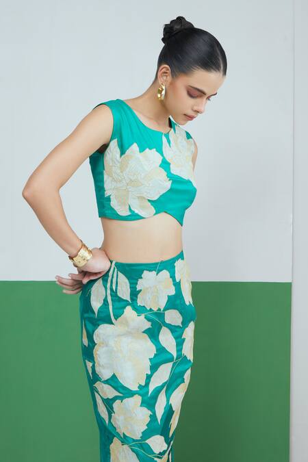 Green crop top featuring gardenia zari applique and inverted V hem detailing. Paired with a matching pencil skirt with attached inner lining.