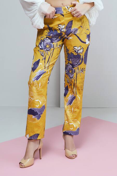 Blue and white crop shirt featuring pleated flounced sleeves and iris blossom applique. Paired with a stretch cotton bustier and floral print pant.