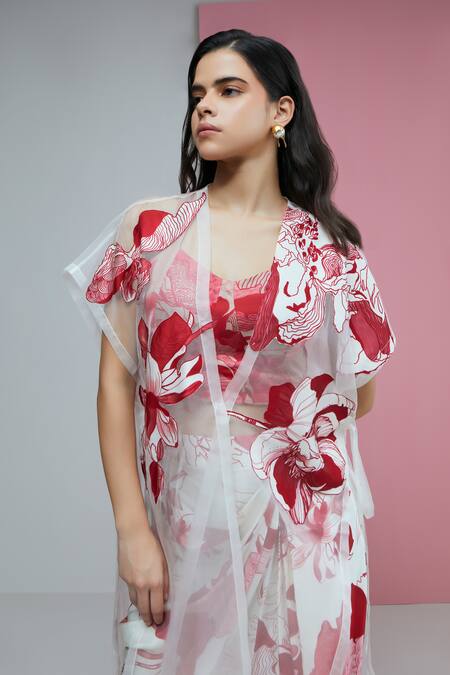White organza cape featuring rafflesia bloom appliqué and side tie-ups. Paired with a printed bustier and draped skirt with slit detail.