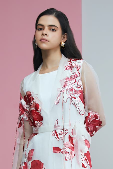 White dress featuring a boat neck and A-line silhouette, paired with a lapel collar organza jacket. The jacket is adorned with red rafflesia bloom applique details and has full sleeves.
