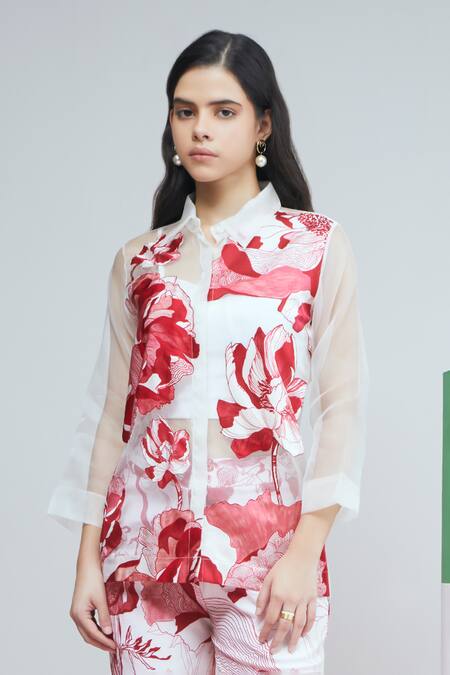 White organza shirt featuring collar neck and three fourth sleeves with rafflesia bloom applique detail. Paired with a solid bustier and floral printed pant.