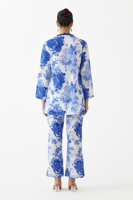 Blue short kurta featuring floral print with sequin-fringe embellishments. Paired with matching printed pants.
