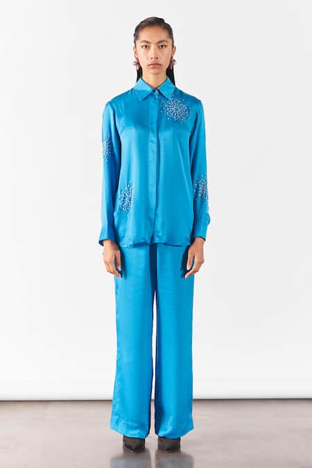 Blue vegan silk shirt featuring snowflake Swarvoski hand embroidery. Paired with coordinating straight pant with side pockets.