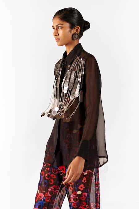 Black organza shirt featuring full sleeves, collar neckline, and sequin and bead embroidery