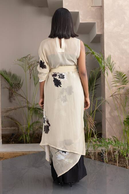 Asymmetric floral printed collar pallu, Embroidered belt with bead detailing