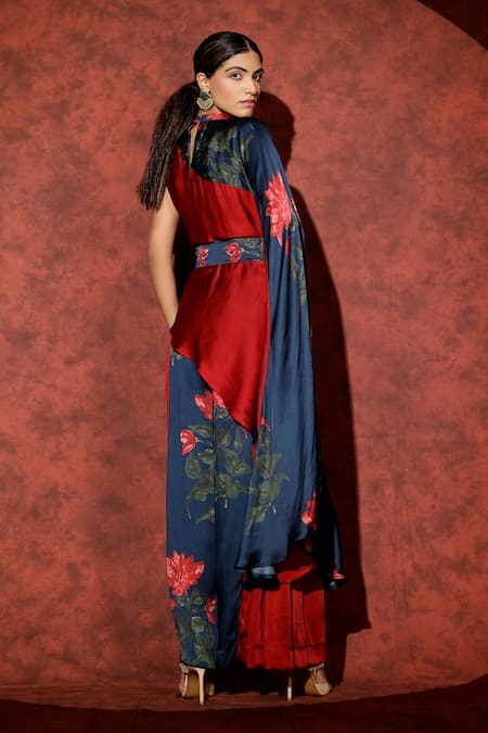 Dark blue floral printed asymmetric top in georgette satin with a red panel. Paired with side pleated pant and a printed belt featuring cutdana embroidery.