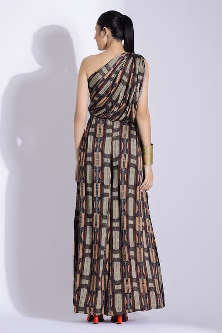 Brown jumpsuit featuring a one shoulder neckline and abstract patterns