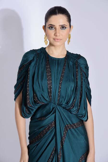 Green georgette satin gown featuring a round neckline and batwing sleeves