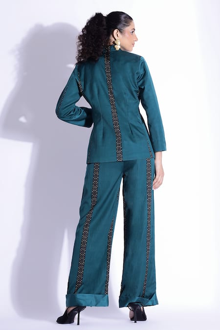 Teal jacket featuring a lapel collar, full sleeves, and embellished pockets. Paired with matching pants showcasing tribal print panels.