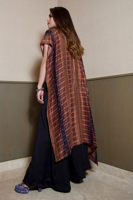 Black kalidar skirt in georgette satin featuring a detachable draped printed dupatta. The set includes a blouse with a closed collar and asymmetric sleeves.