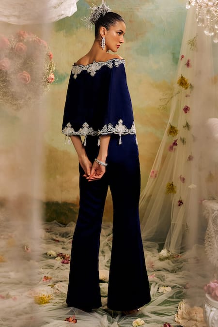 Blue Organza Embroidery, Cut Work, Beads Off-shoulder Cutwork Top Pant Set