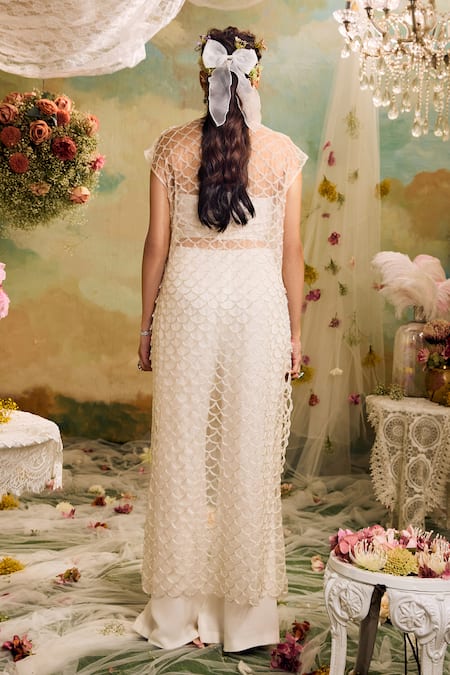 White Organza, Georgette Tassels Round Cutwork Embroidered Overlay Trouser Set