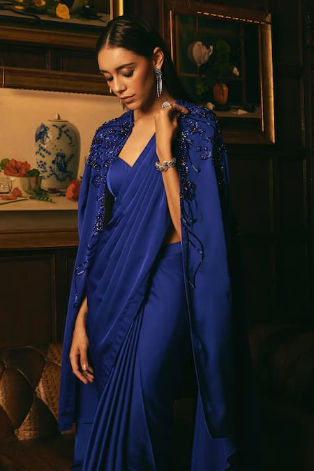 Blue flared cape featuring tube beads embroidered leaf motifs and asymmetric hem detailing. Paired with a coordinating solid pre-draped saree and padded blouse.