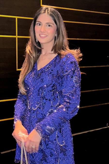 Electric blue kurta featuring sequin, bead and tassel hand embroidery. Paired with a flared pant also adorned with sequin and bead work.